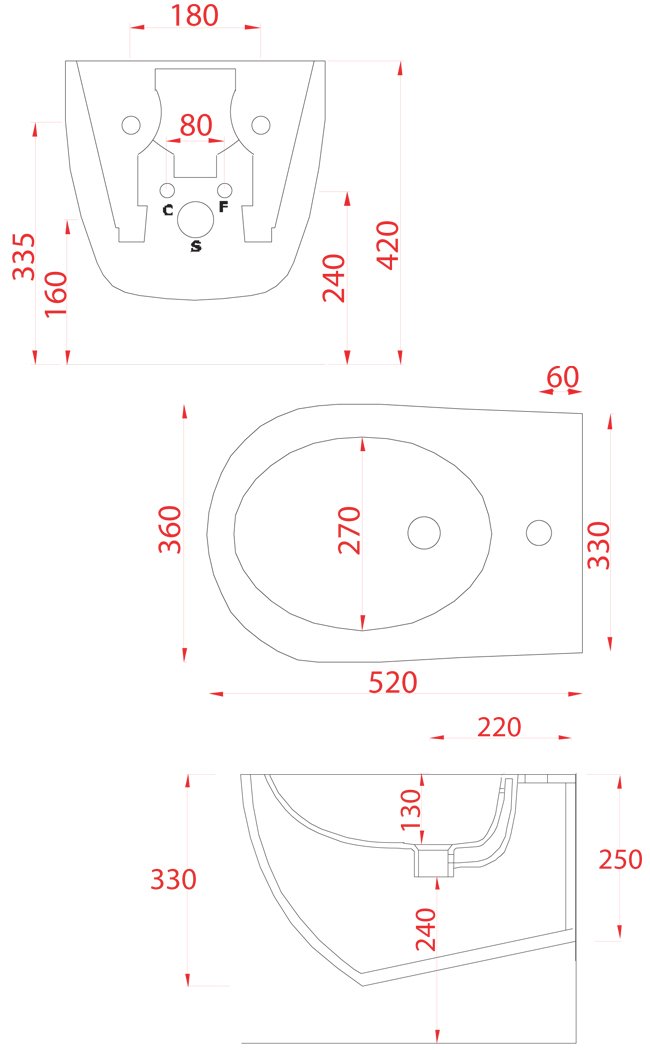 Техническая схема: Artceram биде подвесное FL35 36х54 см коллекция File