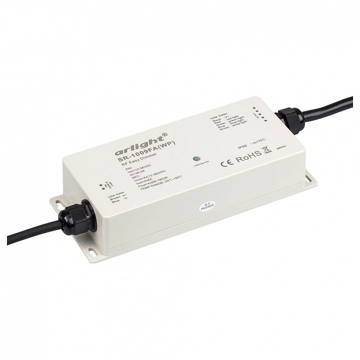 Дополнительные параметры Влагозащищенный контроллер для светодиодной RGBW ленты (ШИМ)., Питание/рабочее напряжение 12-36VDC, максимальный ток 5A на канал, 4 канала, максимальная мощность 240-720W., Степень влагозащиты IP67., Корпус - PVC., Габариты 180х73х38 мм., Управляется пультами и панелями серии SR-1009x (поставляются отдельно)., Список совместимых пультов и панелей смотрите в сопутствующих товарах и в инструкции.