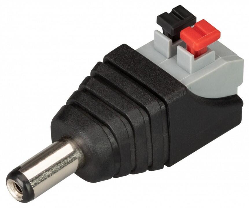 Коннектор для подключения светодиодных лент к сетевым адаптерам с DC-коннектором 5.5 мм (напряжение не выше 48 В). Одна сторона - клеммная колодка самозажимная для провода ленты, вторая - DC-разъем (папа) для сетевого адаптера. Номинальный ток 3 А.